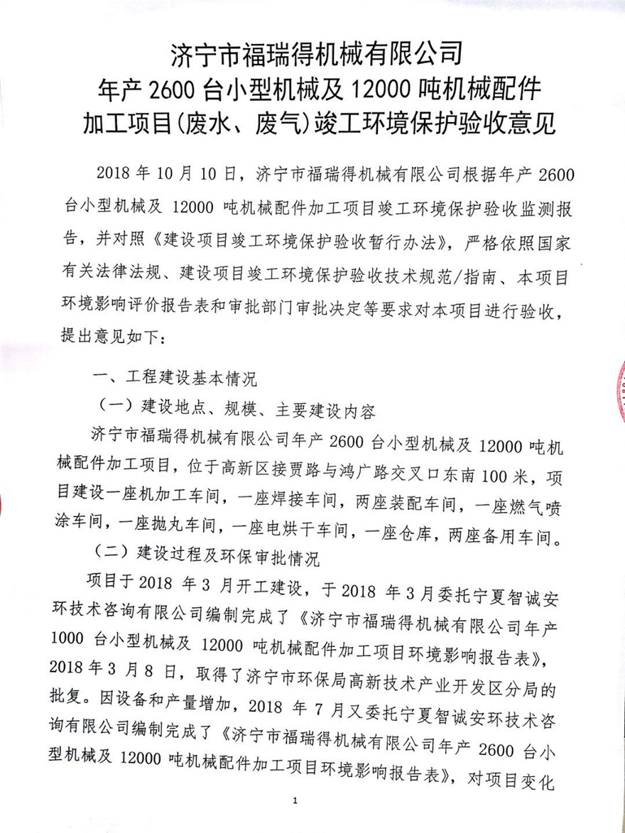 濟寧市福瑞得機械有限公司年產2600臺小型機械及12000噸機械配件加工項目(廢氣、廢水)竣工環(huán)境保護驗收意見