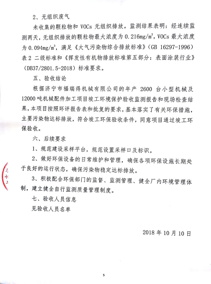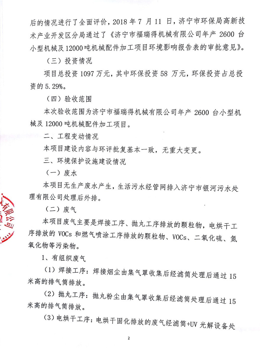 濟寧市福瑞得機械有限公司年產2600臺小型機械及12000噸機械配件加工項目(廢氣、廢水)竣