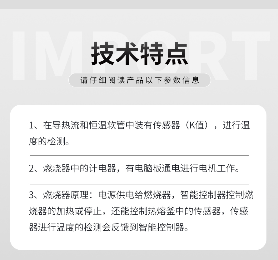 燃燒器原理:電源供電給燃燒器,智能控制器控制燃燒器的加熱或停止,還能控制熱熔釜中的傳感器,傳感器進行溫度的檢測會反饋到智能控制器。