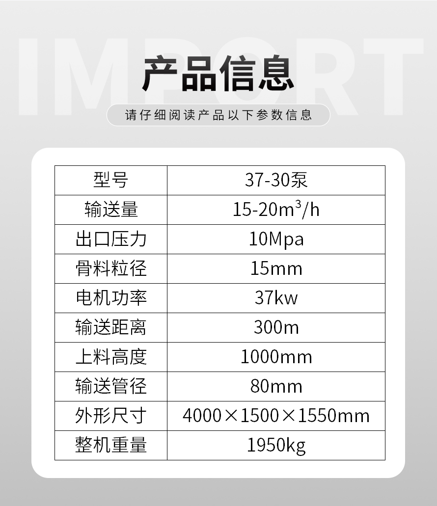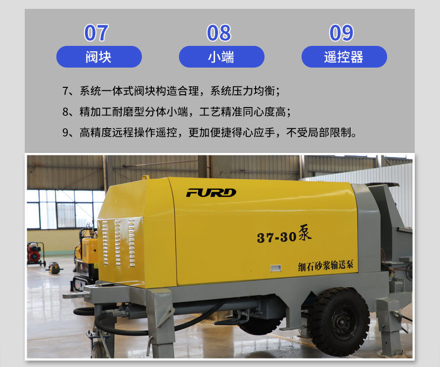 產(chǎn)品介紹: 1,大流量 采用加粗料缸,讓機(jī)械每一次循環(huán)出料多20% 2,效率高 移動(dòng)便捷全部采用快接式管道卡,提高工作效率 3,便捷 本機(jī)可遠(yuǎn)程遙控,操作不受地點(diǎn)限制,更加人性化 產(chǎn)品用途: 坡道灌漿,水平地面,隧道澆筑,模