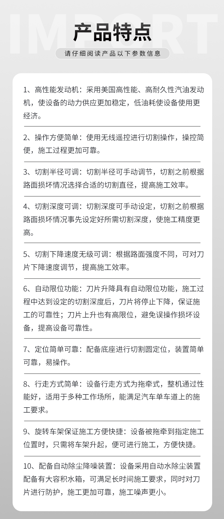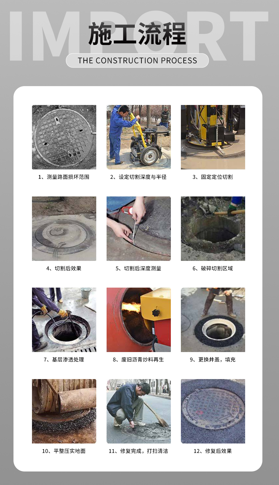 專(zhuān)門(mén)用于對(duì)城市道路中機(jī)動(dòng)車(chē)道等井蓋周?chē)乃嗷炷粱驗(yàn)r青路面進(jìn)行圓形切割。為清楚井蓋周?chē)钠茡p路面提供分割區(qū)域,修復(fù)后的地面美觀,延長(zhǎng)了路面的使用壽命。